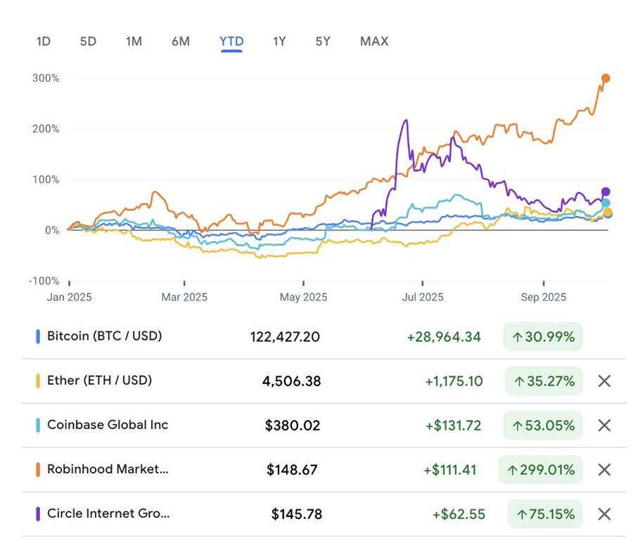 In comparison, Bitcoin rose 31%, Ethereum rose 35%, and Solana rose 21%. Crypto stocks have clearly outperformed.
