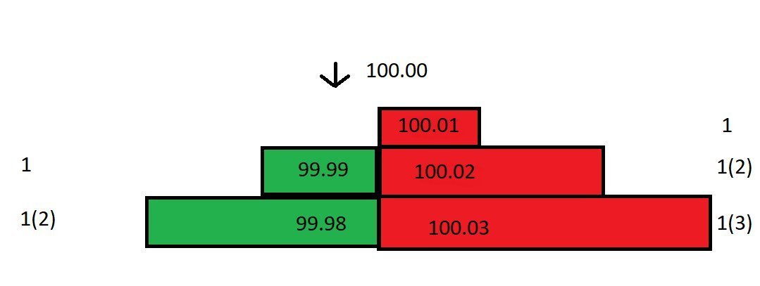 Because the buy one position was removed, the order book structure has changed, and the spread is now 0.02. However, the market price is still 100, because this was the last traded price: