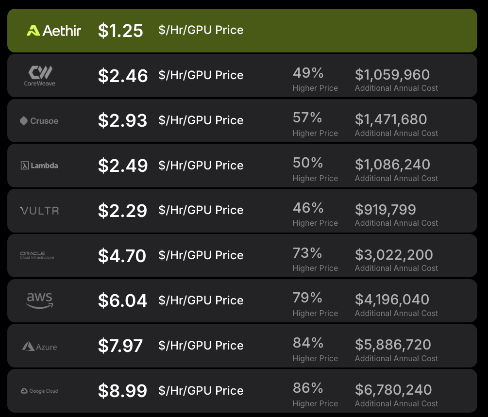 Aethir's true competitors are Web 2's centralized computing and cloud service companies, and its greatest advantage lies in its competitive pricing. " For example, right now, the price on our platform is about one-tenth of AWS's ." As shown in the figure below, while Aethir's hourly GPU price is significantly lower than that of Google, AWS, and Oracle, it also offers enterprise-grade computing resources for large-scale LLM training and cloud game rendering.