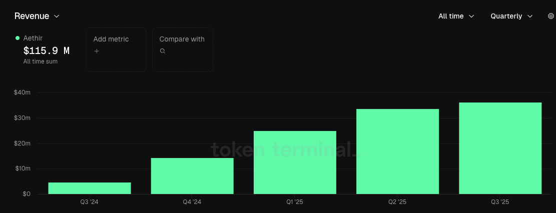 While the Web 3 narrative has shifted this year to DATs and RWAs, Aethir has continued to deliver strong revenue results. In Q3 2025, Aethir's revenue exceeded $39.8 million, a 22% quarter-over-quarter increase. Its average monthly revenue reached $13.29 million, a record high for the company, and its revenue/market cap ratio reached 14.46% (industry average: 8–23%).