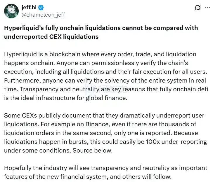 Hyperliquid founder Jeff Yan directly fired back on social media: "Some centralized exchanges have publicly stated that they severely underreport user liquidations. For example, on Binance, even if there are thousands of liquidation orders in the same second, only one is reported. Because liquidations are sudden events, in some cases, the underreporting can easily reach 100 times."