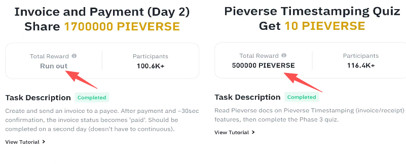 Taking the Pieverse Booster Program Phase 3 activity as an example, after clicking on a task with token rewards, as shown in the figure below, if it shows "Run out", it means that the limit has been reached. If the token number is still displayed, you can still participate and earn tokens.
