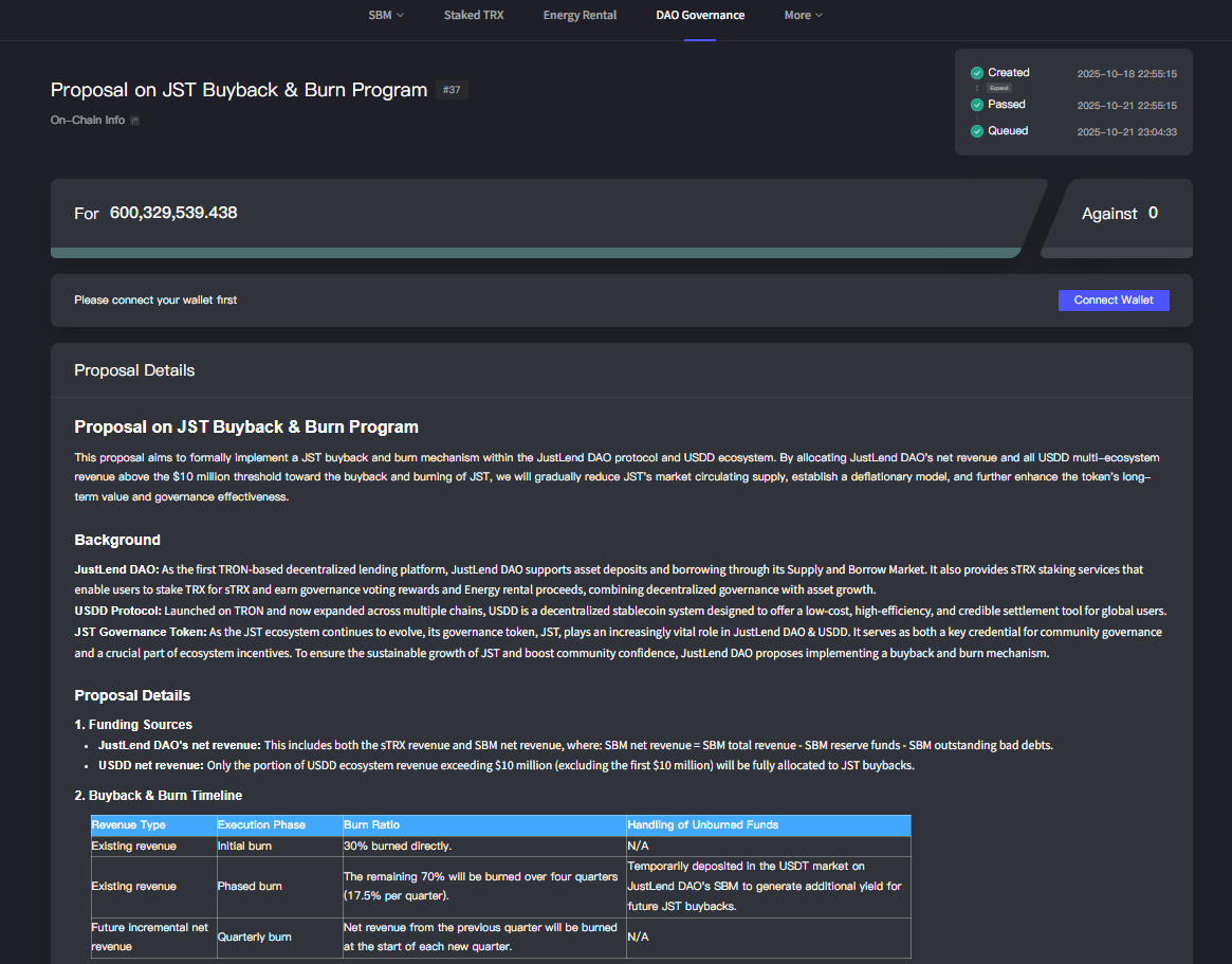 On the evening of October 21st (SGT), the JustLend DAO community's proposal for a "JST buyback and burn" program was officially approved with a high vote of approval. This marks the transition of JST's deflationary mechanism from planning to implementation. The JustLend DAO and USDD ecosystems will officially establish a targeted JST buyback and burn mechanism. This mechanism will propel JST into a deflationary era, laying the foundation for a new round of value appreciation and the unleashing of long-term growth potential.