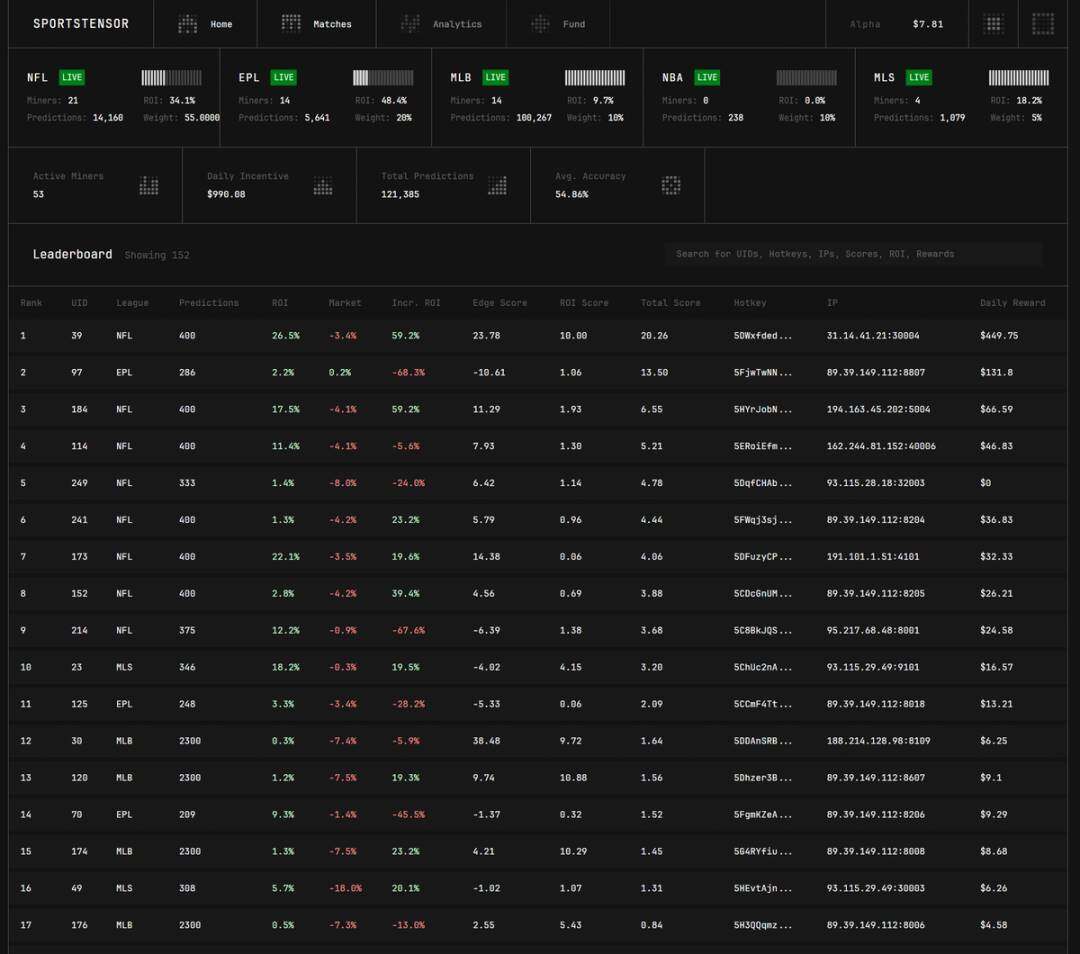 This subnetwork focuses on "beating the market odds," aiming to uncover "advantage opportunities" in the global sports betting market. This is an ongoing competition: machine learning engineers must deploy models to predict the outcomes of major sports leagues such as Major League Baseball (MLB), Major League Soccer (MLS), the English Premier League (EPL), and the National Basketball Association (NBA). The "best model" that achieves profitability will be rewarded with SN41 Sportstensor Alpha tokens.
