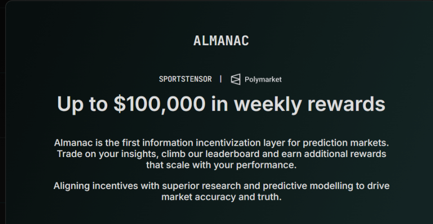 The team is also building the "Almanac" platform, a user-friendly sports prediction competition layer. Users can access signals and advanced predictive analytics provided by Sportstensor miners and compete with other users. Top predictors can receive weekly rewards of up to $100,000 (launch date TBD).