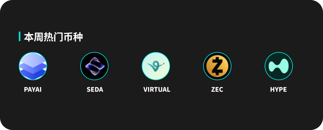 Popular cryptocurrencies, including PAYAI, SEDA, VIRTUAL, ZEC, and HYPE, all saw strong performance. PAYAI saw a 1141.6% price increase this week. SEDA saw a 167.4% increase. VIRTUAL saw a 90.9% increase, with a 24-hour trading volume of 0.6 billion. ZEC and HYPE saw weekly gains of 43.2% and 27.6%, respectively.