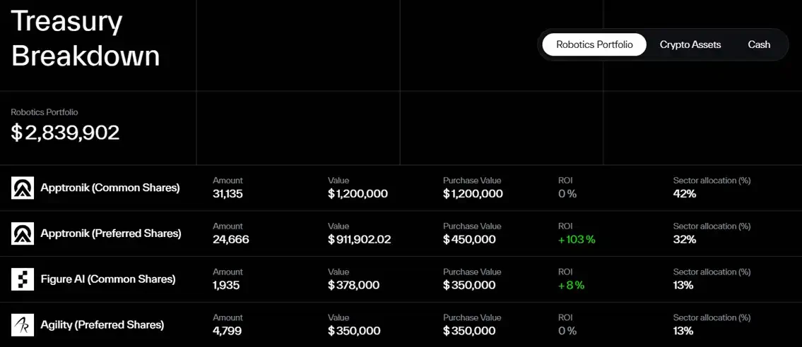 Robots invest in the DAO. Its governance token, $DEUS, has completed three rounds of sales, raising over $5.5 million in crypto assets. The DAO is currently using the proceeds to support Apptronik, Figure AI, and Agility Robotics, all companies in the humanoid robotics field. Screenshots from the official website's vault show that the DAO's investments are already profitable, with some individual investments exceeding 100% returns.