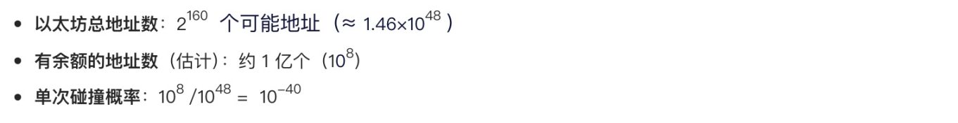 - 核心观点:地址碰撞理论上可行但概率极低。