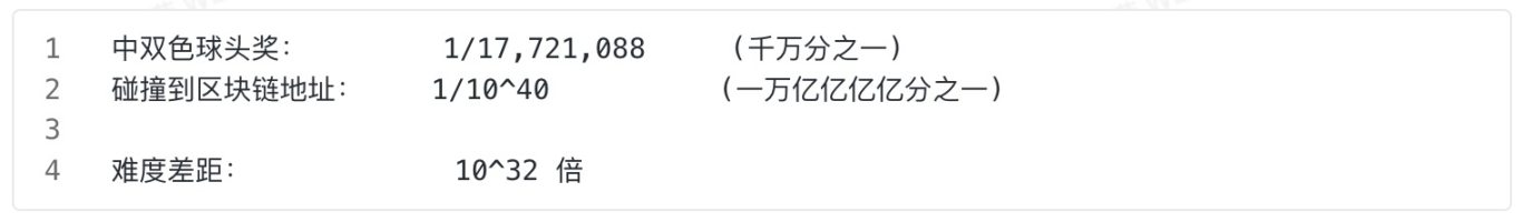 In other words, if the difficulty of winning the lottery is "to randomly find someone in all of China who happens to be you", then the difficulty of address collision is "to randomly select one atom from all the atoms in the universe and get it right 40 times in a row".