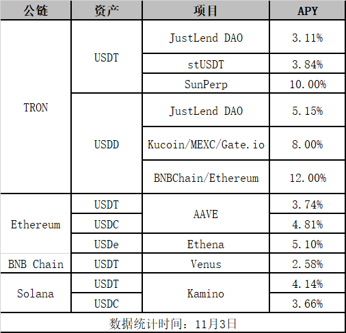 In terms of stablecoin returns, stablecoins within the TRON ecosystem lead the market in risk-free returns, significantly outperforming other mainstream public chains. According to the latest data from November 5th, the annualized yield of stablecoins within the TRON ecosystem can reach over 10%, far exceeding that of mainstream public chains such as Ethereum, BNB Chain, and Solana (which generally offer annualized yields between 3% and 5%), providing a highly attractive investment option for stablecoin investors seeking risk-free returns.