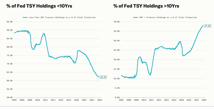 The sharp pullback coincided with the quantitative easing (QE) cycle—when the Federal Reserve intentionally extended the maturity of its holdings of assets in order to suppress long-term yields (this operation is known as "Operation Twist" and QE2/QE3).