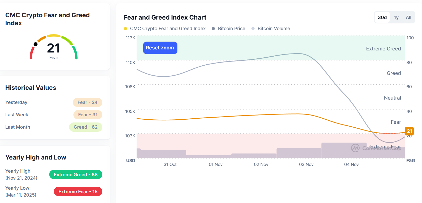 As of November 7, the Fear & Greed Index stood at 21 points at the end of this period, placing it in the "extreme fear" zone. The chart data shows the index continues to decline.