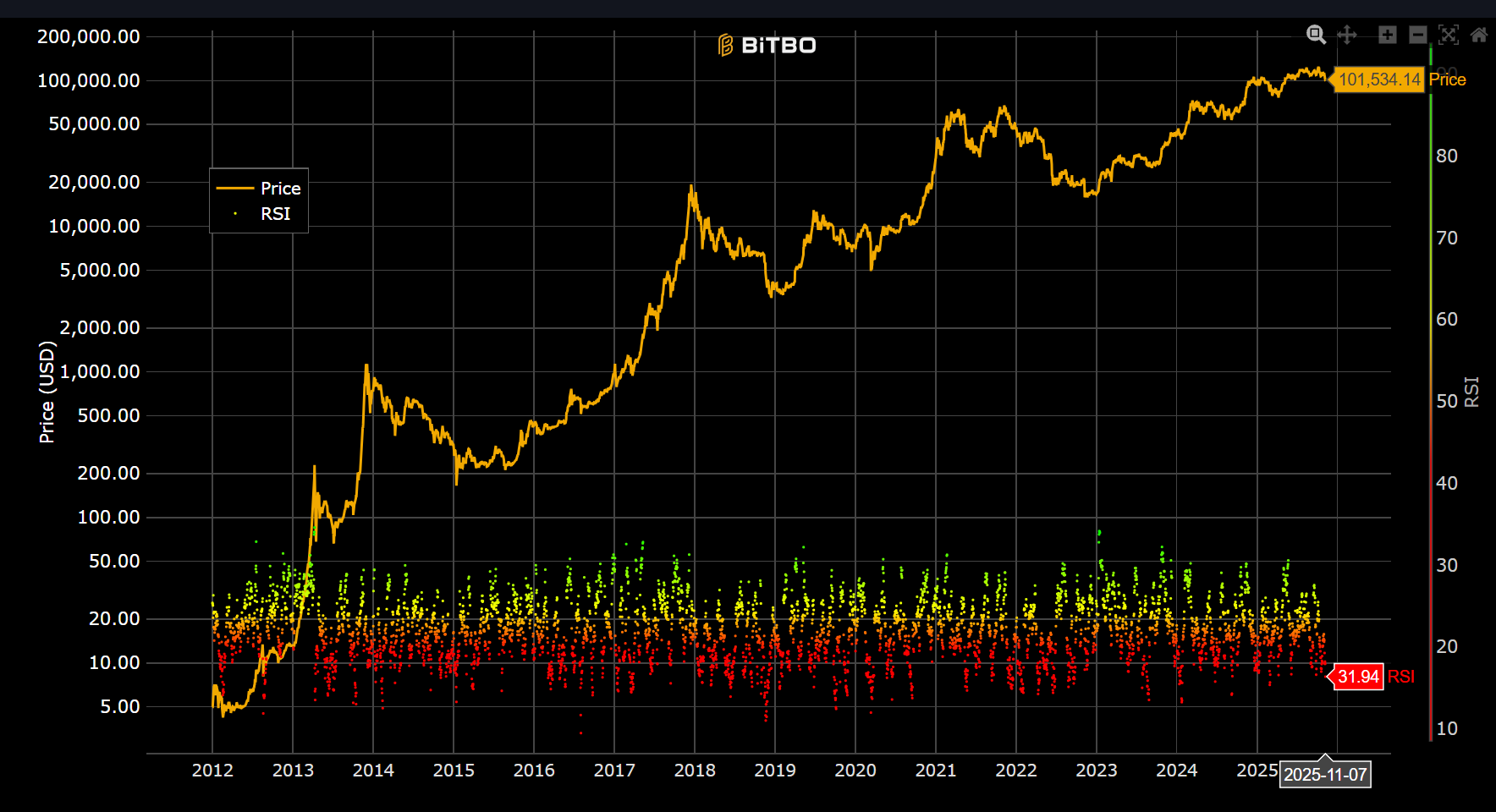 According to the latest data, as of November 7, the RSI was approximately 31.94, falling to a relatively weak level.