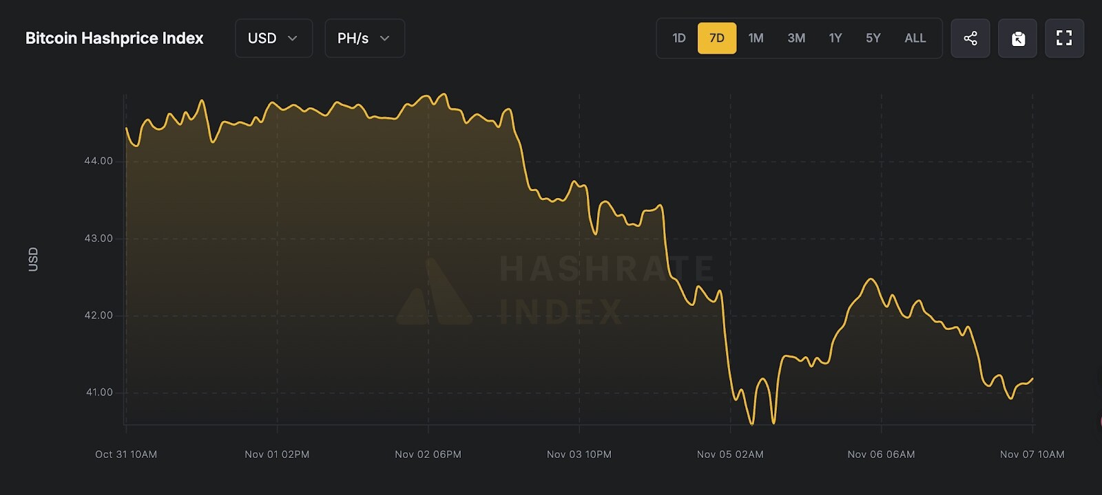 From the perspective of daily revenue per unit of computing power (Hashprice), Hashrate Index data shows that as of November 7, 2025, Hashprice was $41.32/PH/s/day. This week, Hashprice largely mirrored the price movement of Bitcoin, showing a gradual recovery after a high-level pullback.