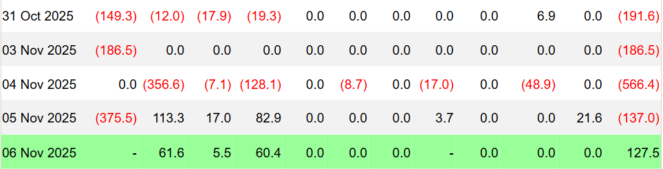 ETF funds saw significant outflows this week, particularly on the 4th and 5th, reflecting institutional withdrawal or a wait-and-see approach as market uncertainty intensified. While there was a small inflow on November 6th, the magnitude was far lower than the outflows of the previous two days, indicating an overall continued outflow trend.