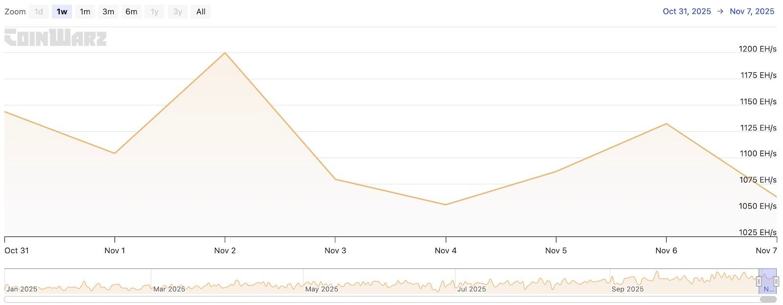 Over the past seven days, the Bitcoin network hashrate has remained relatively stable, with the hashrate this week staying between 1055.21 EH/s and 1200.10 EH/s, which is at a relatively high level.