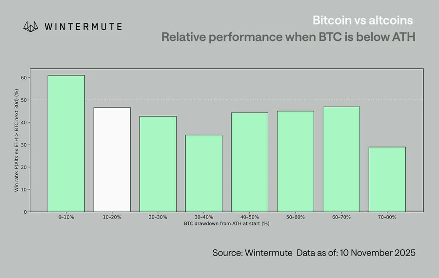 Judging from the current trading situation of mainstream cryptocurrencies, it's still too early to say that altcoin season has begun . Historically, altcoin strength has often occurred when mainstream cryptocurrencies are near their all-time highs, triggering a "wealth spillover effect." When BTC is 10-20% away from its all-time high (currently around 16%), the probability of Bitcoin outperforming altcoins is about 54%; and when BTC falls back to near the $100,000 range, this probability even rises to 58% .