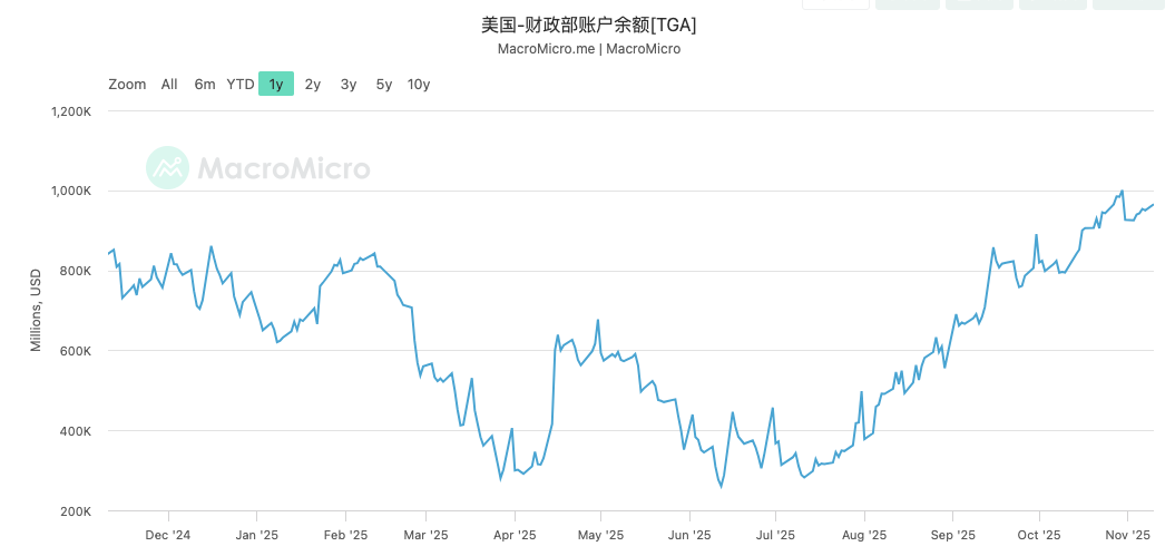 Secondly, the US government shutdown also drained market liquidity. The US Treasury General Account (TGA) is responsible for all government spending, not only paying US civil servants' salaries but also injecting capital into the financial markets. The US government shutdown meant that the TGA could only inflow but not outflow. According to MacroMicro data, during the US government shutdown, the TGA accumulated more than $145.9 billion, and the current balance is $965.3 billion.