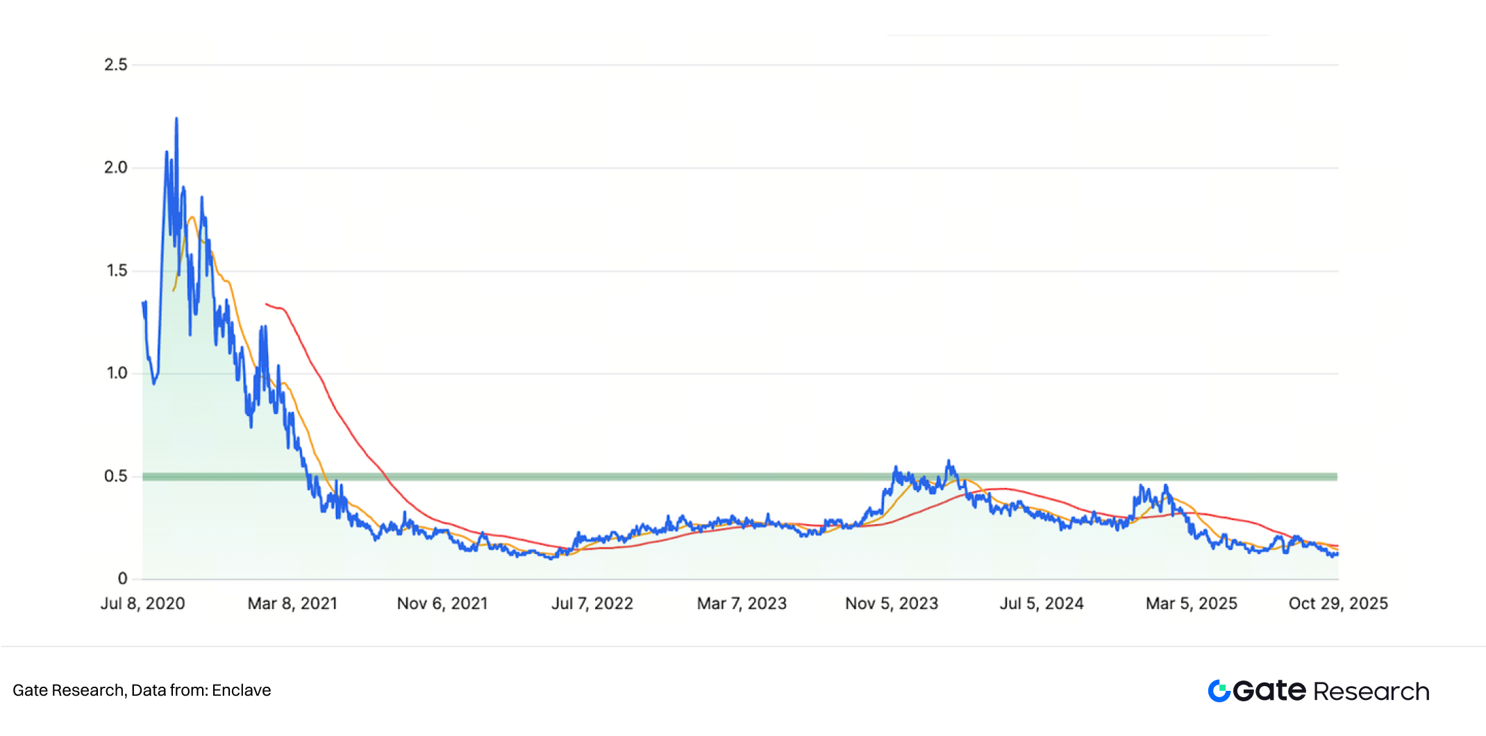 From a valuation perspective, the Market Cap/Total Value Secured ratio has become an important benchmark for assessing LINK's fair price. From 2020 to 2025, this ratio decreased from approximately 2.0 to 0.12, indicating a shift in market valuation focus from speculation to fundamentals. Specifically:
