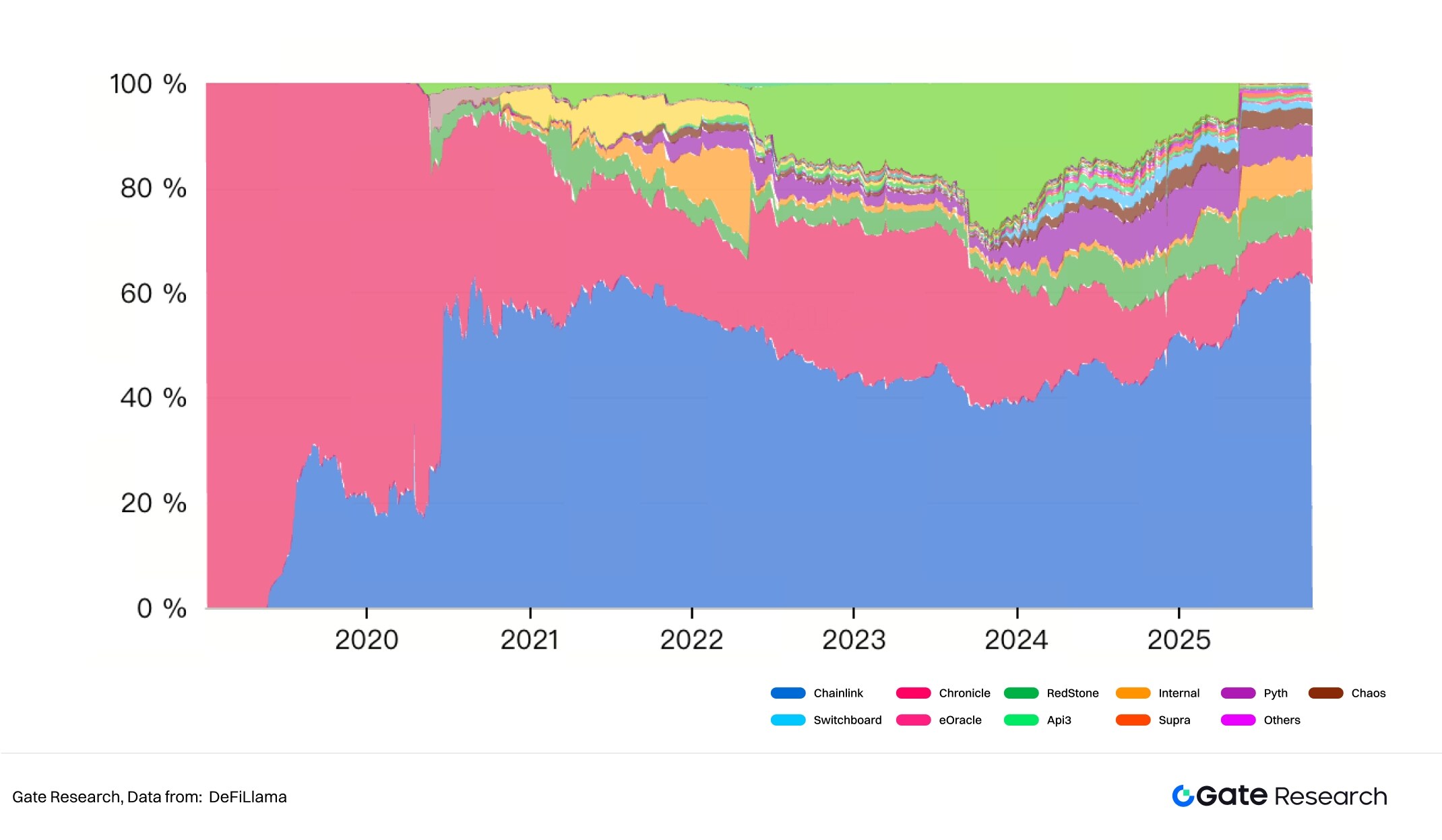 In terms of locked-up capital, the total value of collateral in the industry has exceeded $102.1 billion. Chainlink holds a dominant position with a market share of 61.58% (TVS of $62.922 billion); Chronicle (10.15%) and RedStone (7.94%) follow in second and third place, respectively. Pyth Network ranks fifth with 5.84%, and API3 ranks ninth with 0.55%. Overall, although Chainlink still dominates the market, the penetration rate of emerging protocols is accelerating significantly, and the industry structure is evolving from a unipolar to a multipolar model.