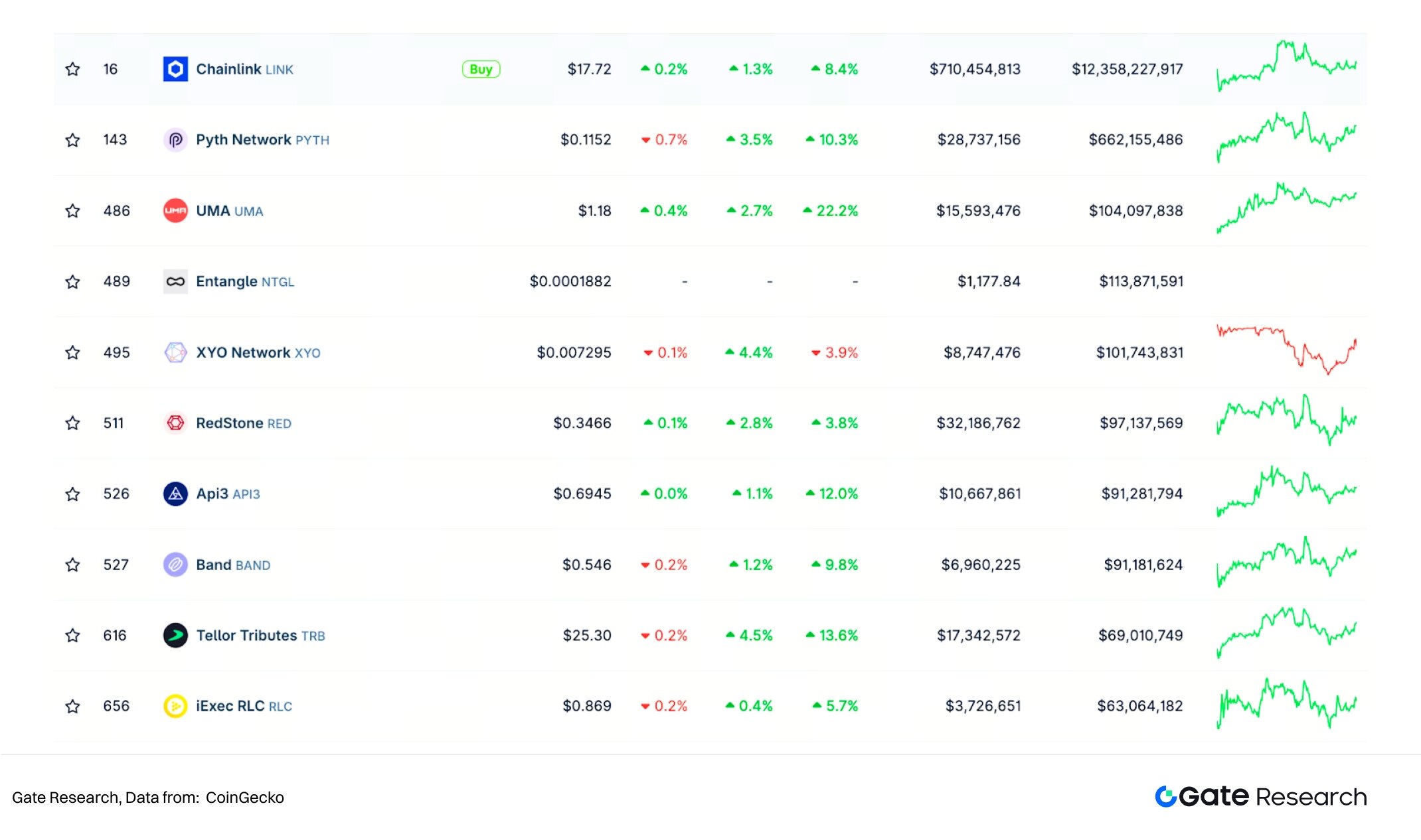 In terms of market capitalization, Chainlink dominates the industry with over 87% market share, at approximately $12.3 billion. This is followed by protocols such as Pyth Network (approximately 4.6%), UMA (approximately 0.73%), and XYO (approximately 0.71%). Chainlink has built a solid ecosystem barrier through its deep integration in core scenarios such as DeFi, cross-chain communication (CCIP), and proof-of-reserves (PoR). Meanwhile, emerging protocols like Pyth, UMA, and RedStone are continuously expanding their competitive advantages through innovations in high-speed data distribution, privacy computing, and first-party data source mechanisms.