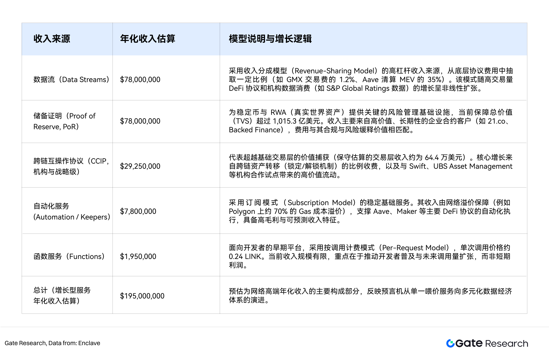 Chainlink's core revenue structure has expanded from a single price feed service to a multi-dimensional data economy system, with recovered revenue used to enhance LINK staking rewards and network sustainability. According to Enclave estimates, network revenue will reach approximately $195 million in 2025, specifically comprised of: