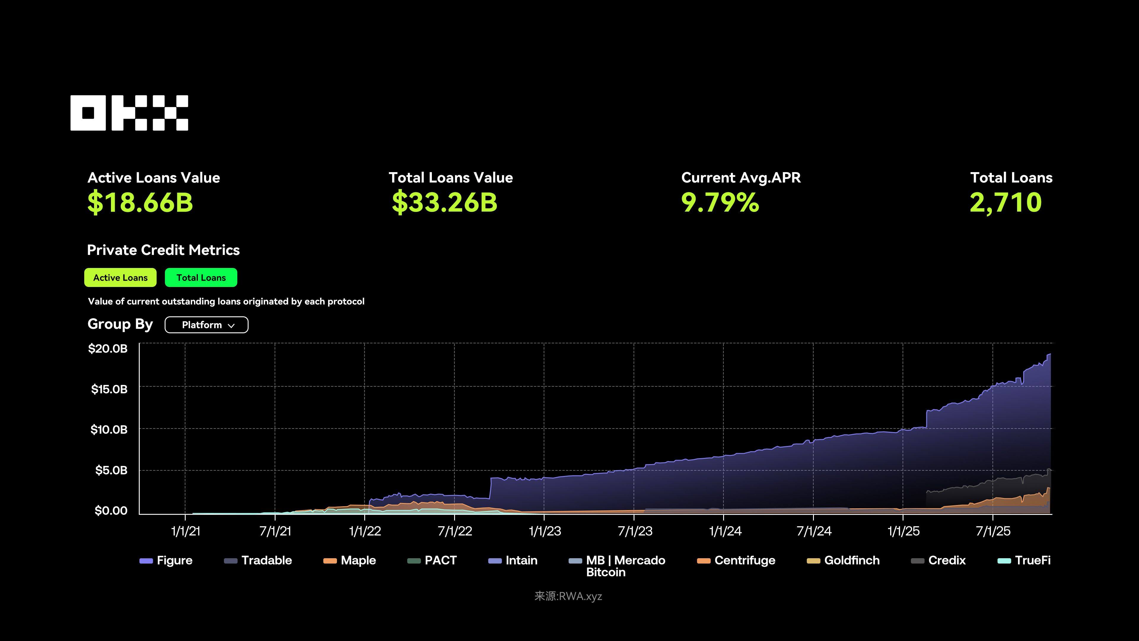 As of November 7, 2025, the active private lending volume in the RWA sector was approximately $18.66 billion, with an average annualized interest rate of 9.79% and a total of 2,710 loans. The Figure platform holds approximately 92% of the market share, with a total loan volume of $17.2 billion; Centrifuge, through its multi-chain architecture and interoperability with DeFi protocols, has seen its TVL grow from $350 million to over $1.3 billion, with a historical annualized return of 8%-15%.