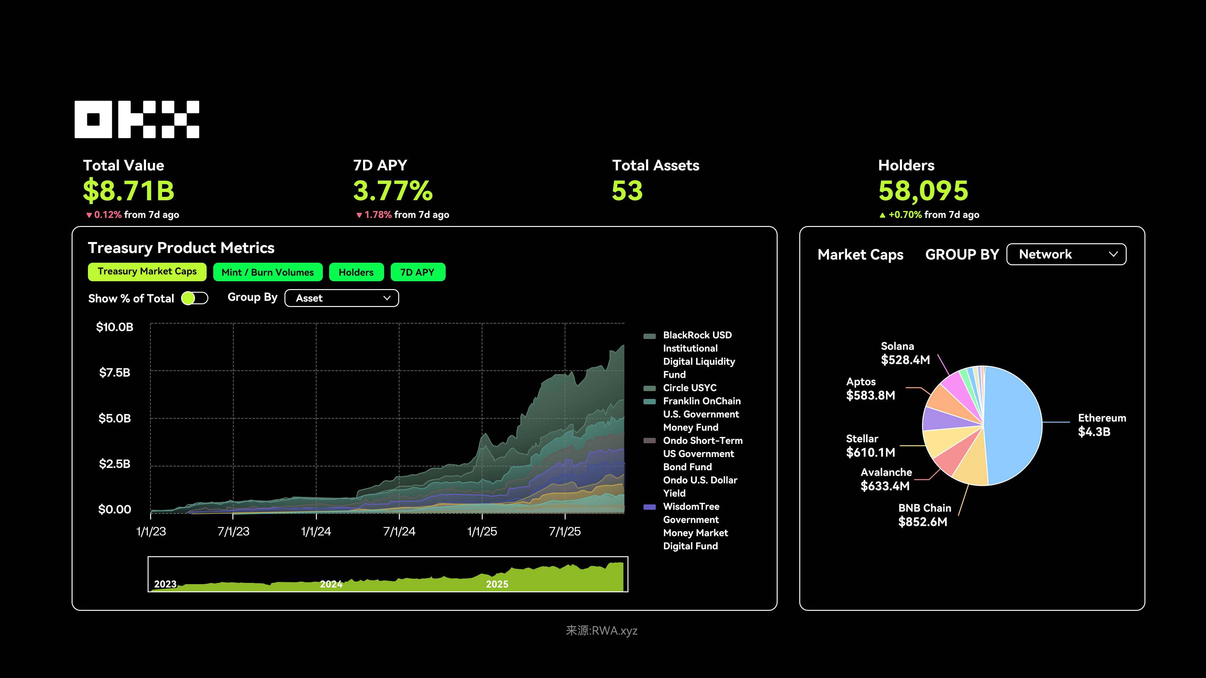 As of November 7, 2025, the total value locked in the tokenized US Treasury market was approximately US$8.7 billion, with over 58,000 holders. The 7-day average annualized yield (APY) was 3.77%, slightly lower than the previous period, reflecting changes in the interest rate environment. In terms of on-chain distribution, Ethereum accounted for over US$4.3 billion, and a multi-chain trend was evident, with VanEck's VBILL fund expanding into multiple ecosystems.