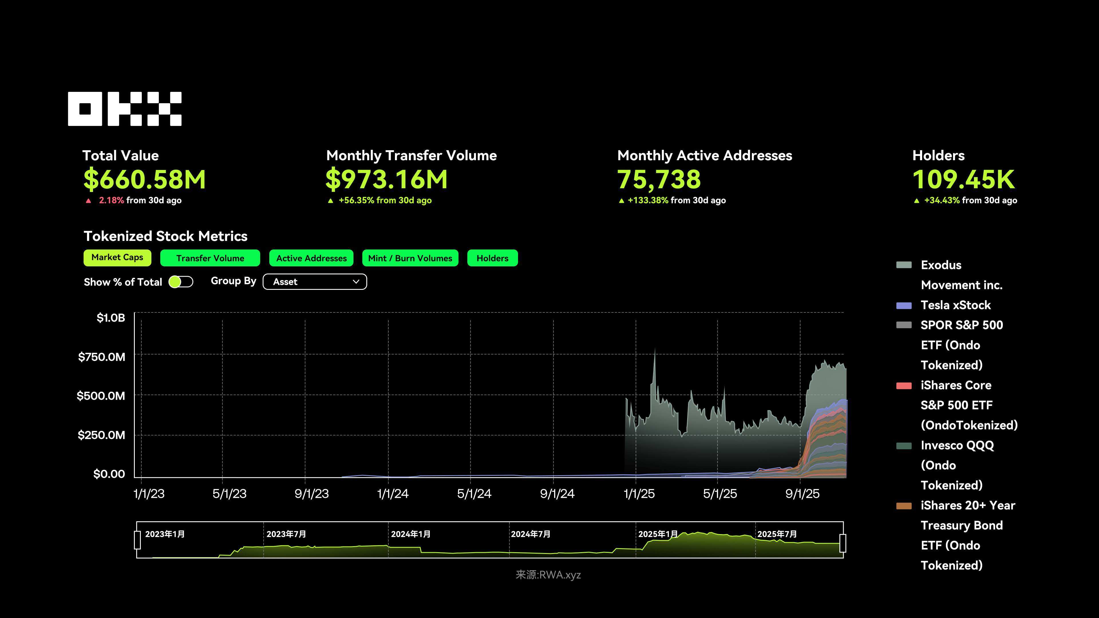 As of November 10, 2025, the total value locked in listed stocks was approximately US$661 million, with a monthly trading volume of US$973 million (up 56.35% month-over-month), 75,738 active addresses (up 133.38% month-over-month), and the total number of holders exceeded 109,000 (up 34.43% month-over-month). Overall, user participation and trading activity are continuing to recover, and the market is entering a new growth cycle.