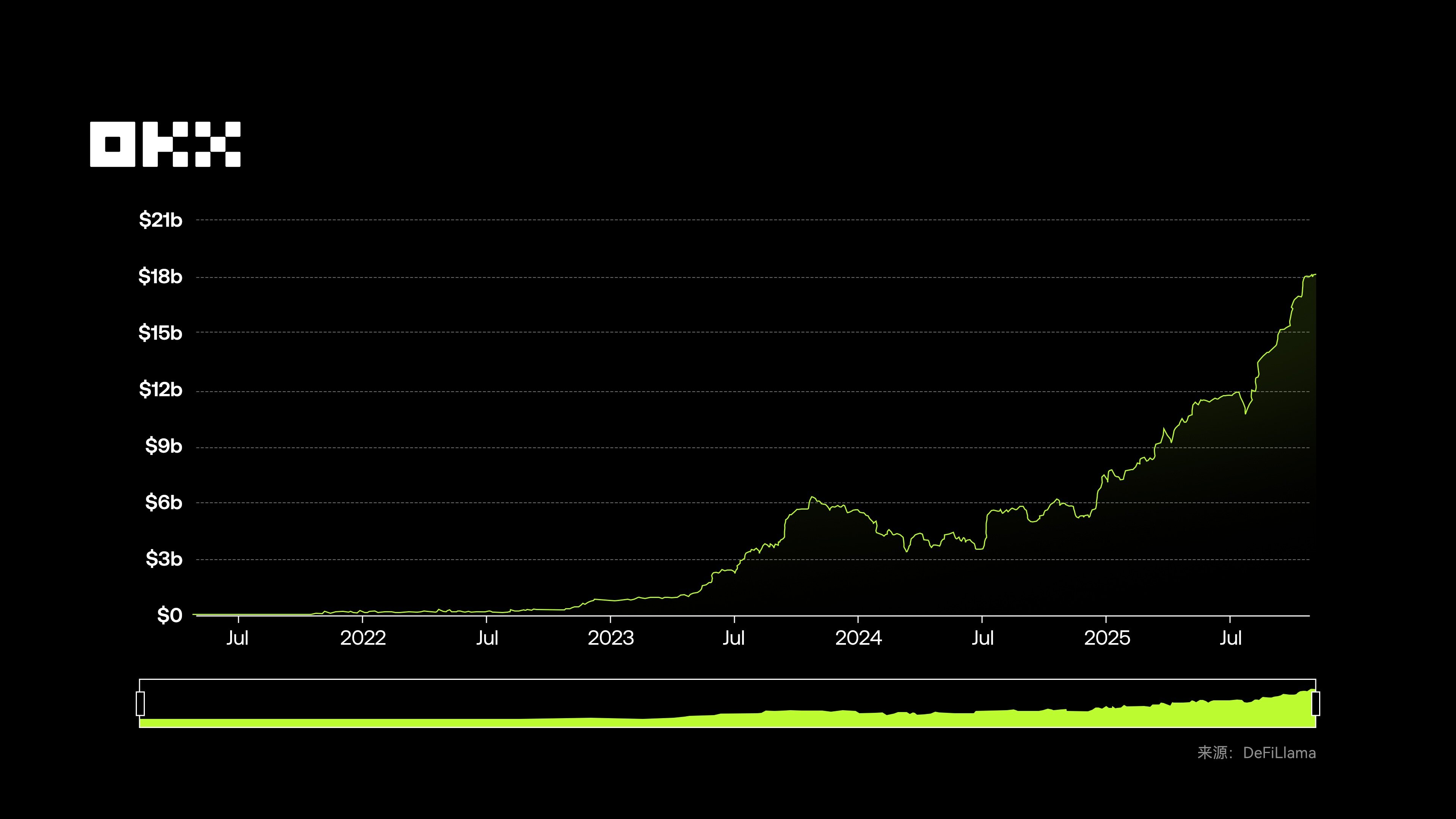 According to DeFiLlama data, the total value locked (TVL) of global RWA reached $18.117 billion, continuing its growth trend. (Note: On-chain RWA totals represent the total value of all related tokens issued on-chain; while TVL specifically refers to the value of RWA held as collateral or interest-bearing assets in DeFi protocols. A large portion of RWA (such as BlackRock's BUIDL) is held directly in users' wallets and not deposited into DeFi protocols, therefore the TVL is much smaller than the total issuance.)