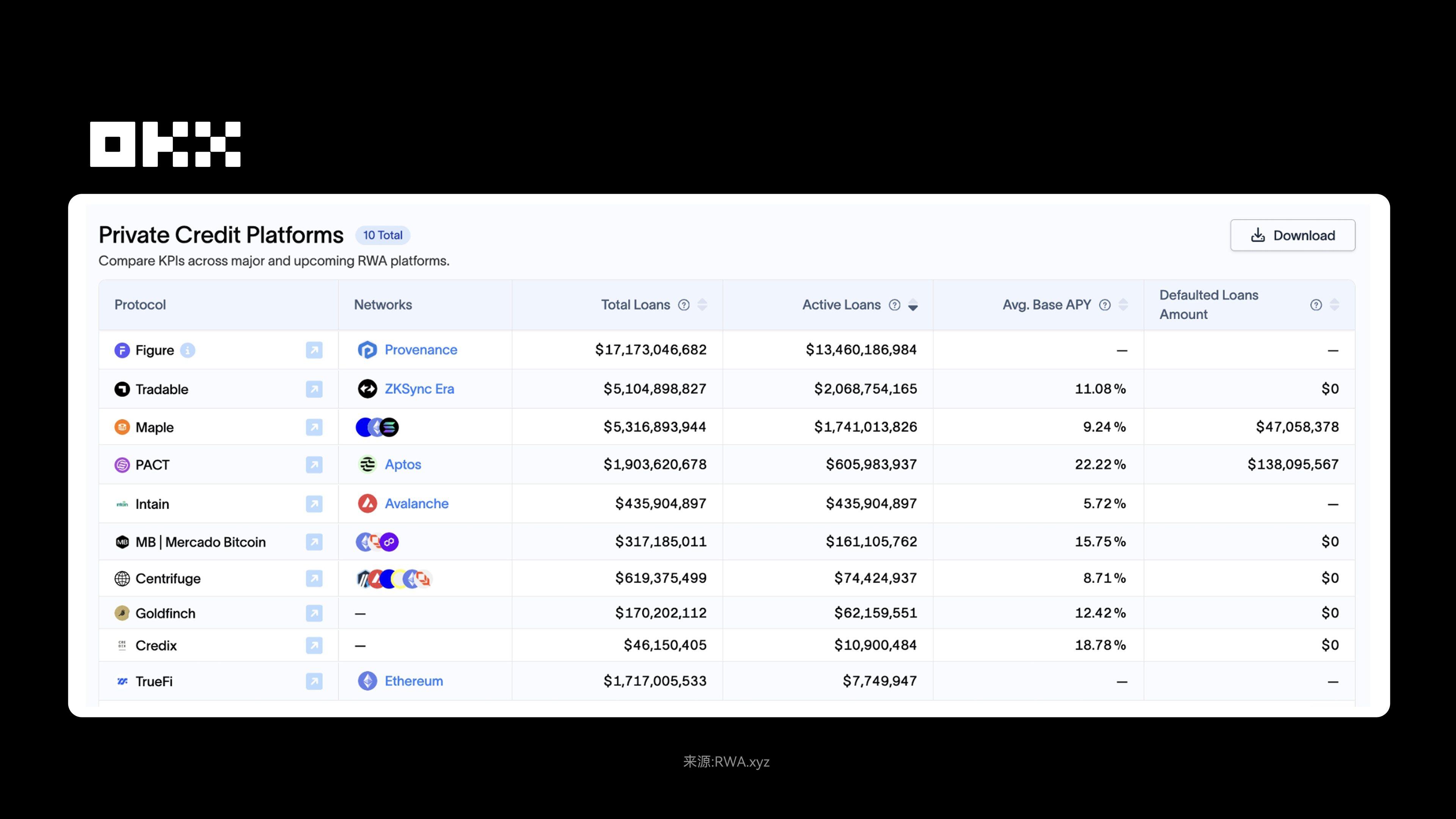 The growth of private lending stems from high yields and relative stability, offering DeFi users 5%-15% annualized returns with volatility independent of the crypto market. Tokenization fragments illiquid assets, attracting global crypto capital, improving liquidity, and empowering traditional lenders. Furthermore, it doesn't redefine credit, but rather provides a more efficient receipt mechanism. Once these assets are on-chain, they can be inserted into lending markets, used as collateral, or packaged into asset-backed securities, just like other crypto assets.