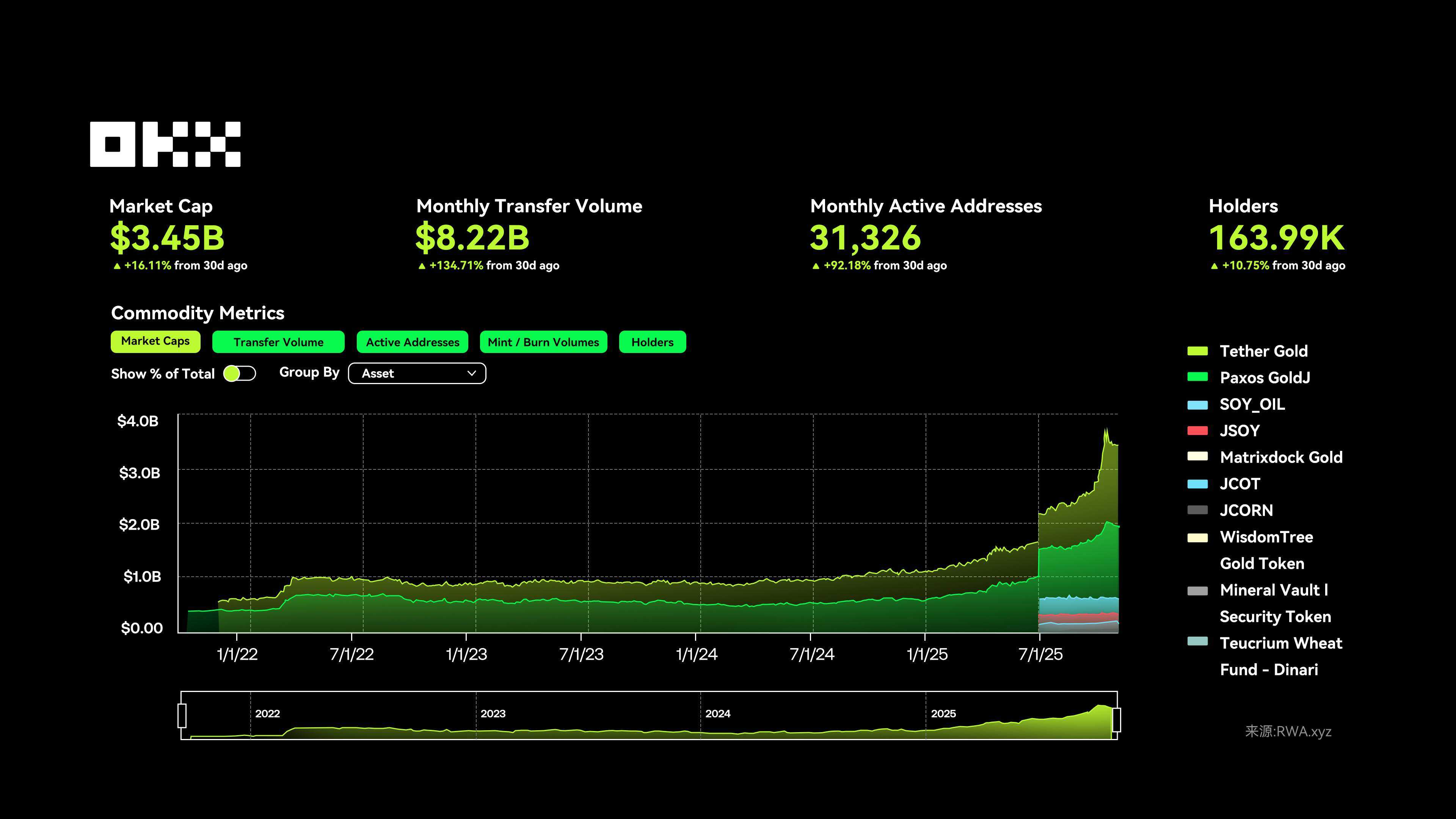 As of November 10th, commodity tokens in the RWA (Real Estate Assets and Services) space are showing significant growth, with the total market capitalization increasing from less than $10 to approximately $3.5 billion, monthly trading volume reaching $8.22 billion, monthly active addresses at 31,326, and the number of holders at 164,000. Gold tokens, in particular, have performed exceptionally well, while tokenized assets of commodities such as oil and soybeans have recently experienced accelerated price increases, with overall market activity and size expanding rapidly.