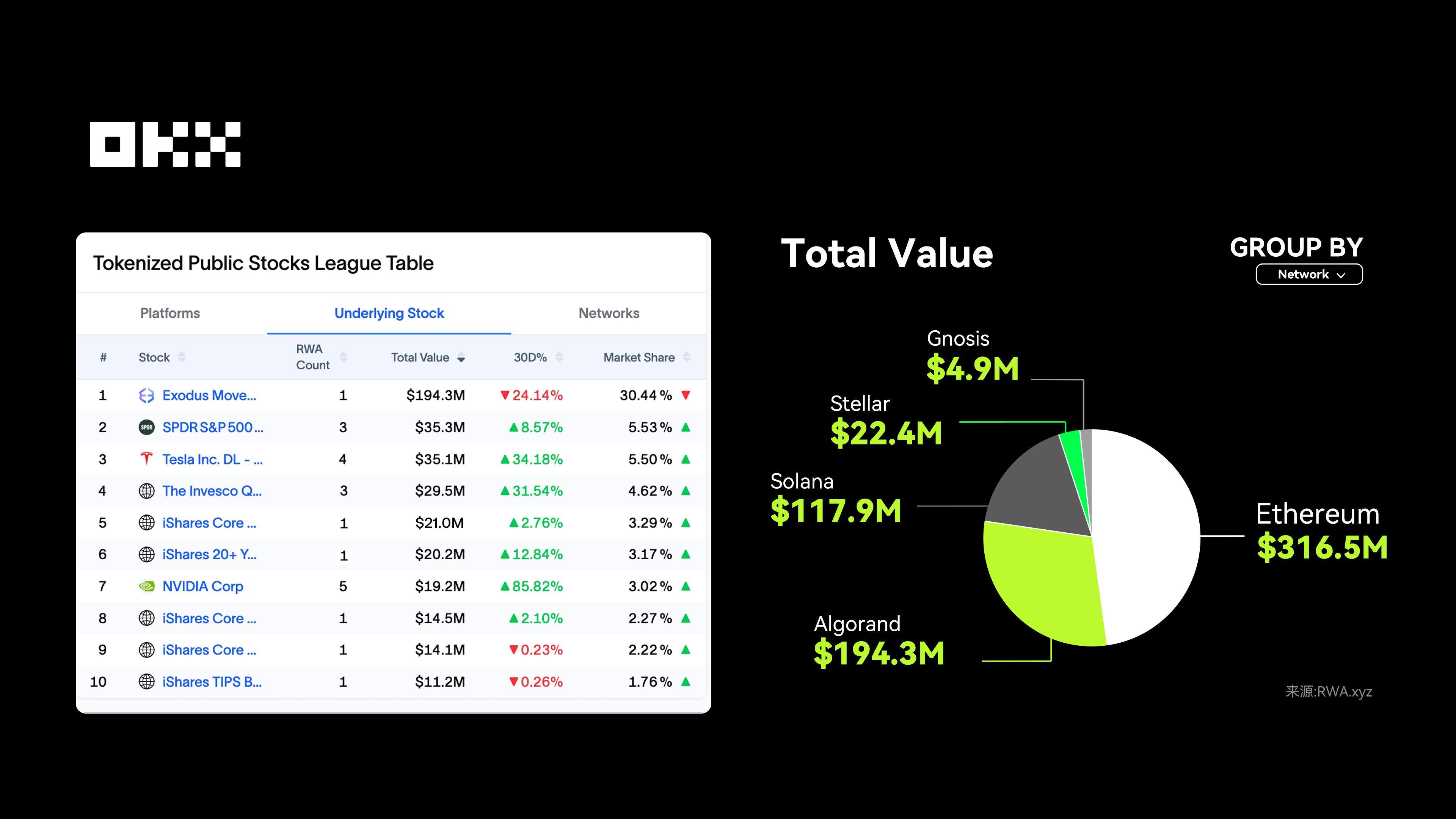 From an asset structure perspective, the core of tokenized stocks currently lies in technology stocks and ETF products, with the market highly concentrated in a few leading projects. For example, Exodus Movement Inc. (EXOD) holds the top spot with a total value of $194 million. On October 20, 2025, Exodus announced the expansion of its common stock tokens to Solana (previously primarily running on the Algorand chain) through Superstate's issuance platform, becoming a representative case of "native on-chain stocks" and demonstrating that compliant equity tokenization is moving from concept to reality.