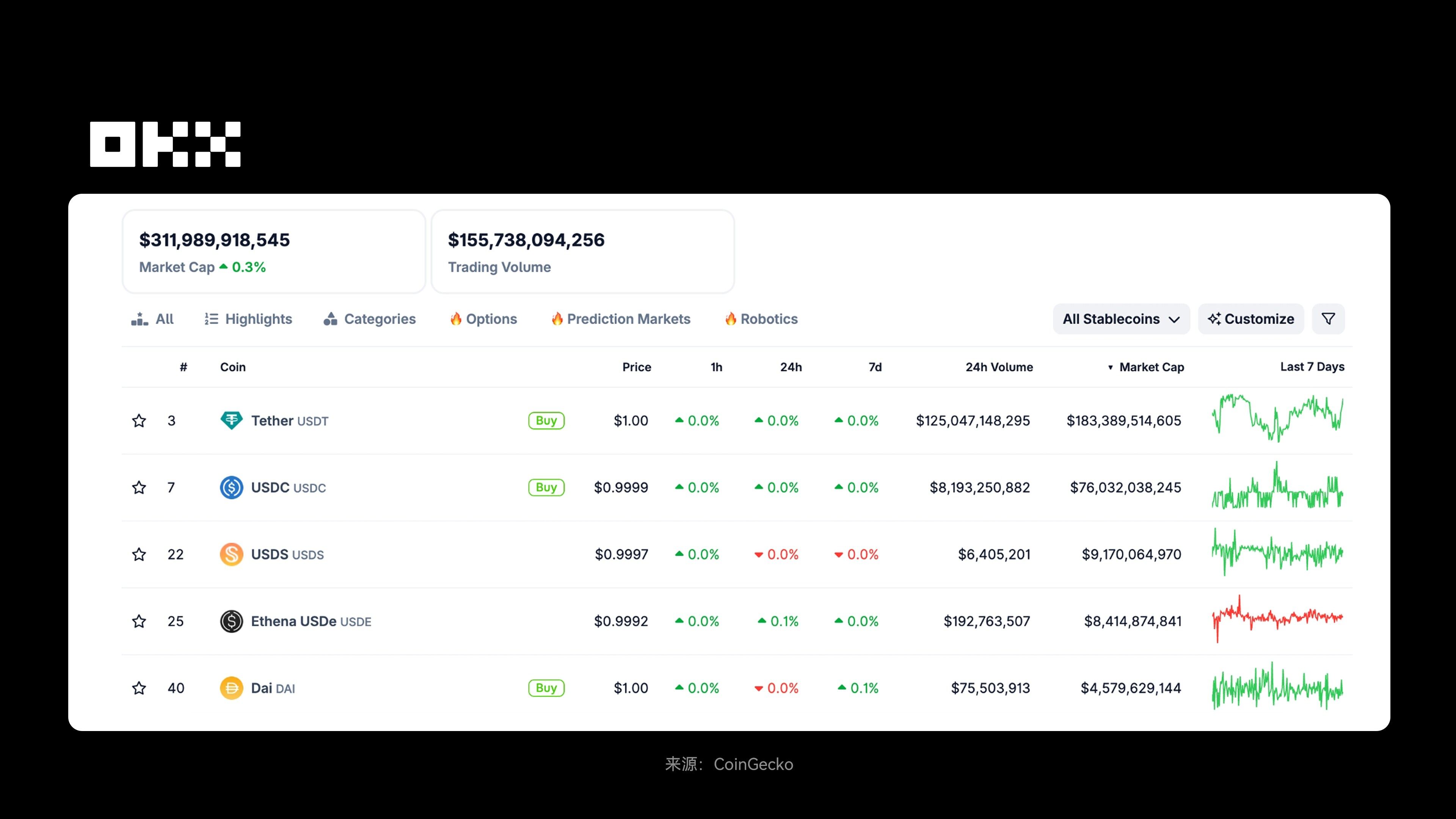 The stablecoin market is highly concentrated, with USDT and USDC accounting for over 80% of the market capitalization. These stablecoins are primarily backed by fiat currency, cash, and US Treasury reserves, exhibiting a high degree of centralization and mainly used in traditional scenarios such as cross-border payments, transaction settlements, and corporate payroll. In contrast, smaller stablecoins like DAI, USDe, and sDAI employ yield-based or over-collateralized models, are partially decentralized, rely on on-chain monitoring and smart contracts, and serve DeFi, on-chain lending, and asset tokenization. These stablecoins carry higher risk and volatility. Overall, centralized fiat-backed stablecoins offer lower risk and greater transparency, while innovative stablecoins emphasize on-chain financial functions and automated returns.