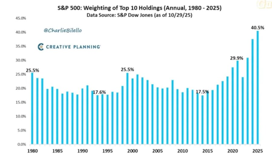 - Currently, the top 10 companies account for about 40% of the market capitalization of major US stock indices.