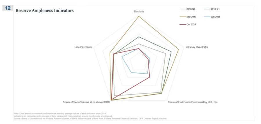 In this spider chart, the most intuitive signal is that " the proportion of repurchase transactions that reach or exceed IORB " is the most direct indication that we are quietly leaving a state of truly abundant reserves.