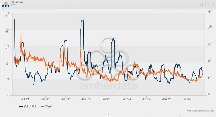 A clearer pattern emerges when observing the Bitcoin Volatility Index (VVII), which is essentially the second derivative of volatility, or a reflection of the rate of change of volatility itself. Historical data shows that the highest VVII occurred during the FTX crash, when it surged to approximately 230. However, since the ETF received regulatory approval in early 2024, the Bitcoin VVII has never broken 100, and implied volatility has consistently declined, unrelated to spot price movements. In other words, Bitcoin seems to have abandoned the high volatility characteristic of the market structure prior to the ETF launch.