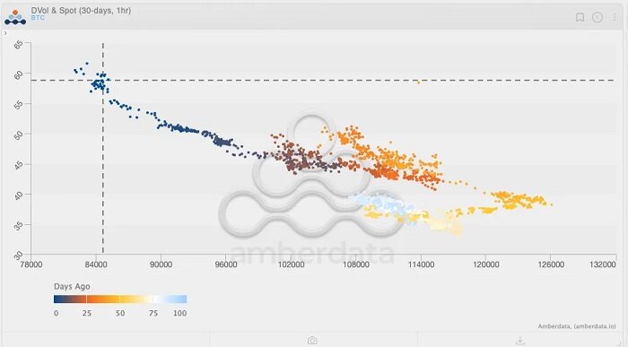 Refer to the chart above and note the color gradient (light blue to dark blue represent "a few days ago"). Tracking recent price action, you'll notice a brief window where the spot Bitcoin volatility index climbed to around 125, while implied volatility also increased. At that time, Bitcoin's volatility indicators seemed to suggest a potential market breakout, given the previous positive correlation between volatility and spot price. However, contrary to expectations, as everyone now knows, the market subsequently reversed course and fell.
