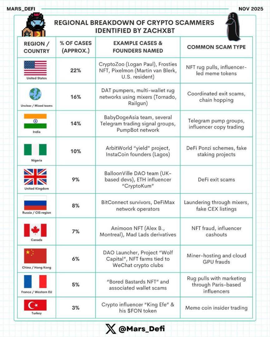 ZachXBT's investigation also uncovered scams perpetrated by US YouTube bloggers, European DeFi developers, and Asian marketing groups. Cryptocurrency scams are not determined by nationality, but rather by a combination of unchecked anonymity, greed, and regulatory indifference.