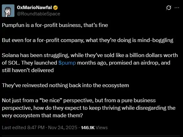 "Even if pump.fun is a for-profit company, their actions are baffling. Solana has been struggling, while they've sold billions of dollars worth of SOL. They completed their $PUMP ICO a few months ago with a promise of airdrops, but haven't delivered, nor have they reinvested in the ecosystem. Even setting aside the ethical considerations of this company doing good, from a purely business perspective, how can they expect the ecosystem that made them successful to continue thriving when they are so indifferent to it?"