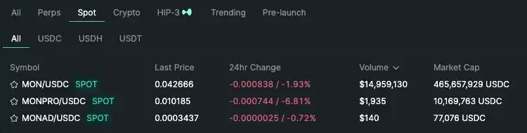 At the time, Hyperliquid was still in its early stages, and the spot bridging project Unit had not yet been launched. Apart from large-cap assets such as HYPE and PURR, other spot trading pairs generally lacked liquidity. Mon Protocol's tokens performed almost identically to Rug after their launch.