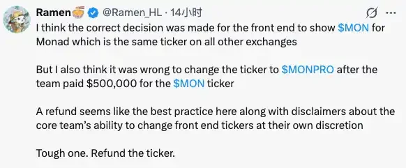 "To avoid confusion, showing $MON to Monad might be correct, but forcing a name change after someone has paid $500,000 is wrong. A refund seems to be the best course of action."