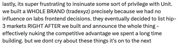 "We built the entire brand (tradexyz) from scratch precisely because we had no influence over Labs' front-end decisions. They ultimately decided to launch HIP-3 on their official front-end immediately after we finished and announced the entire project—which effectively destroyed the competitive advantage we had spent a lot of time building. But we won't complain about it; we will move on."