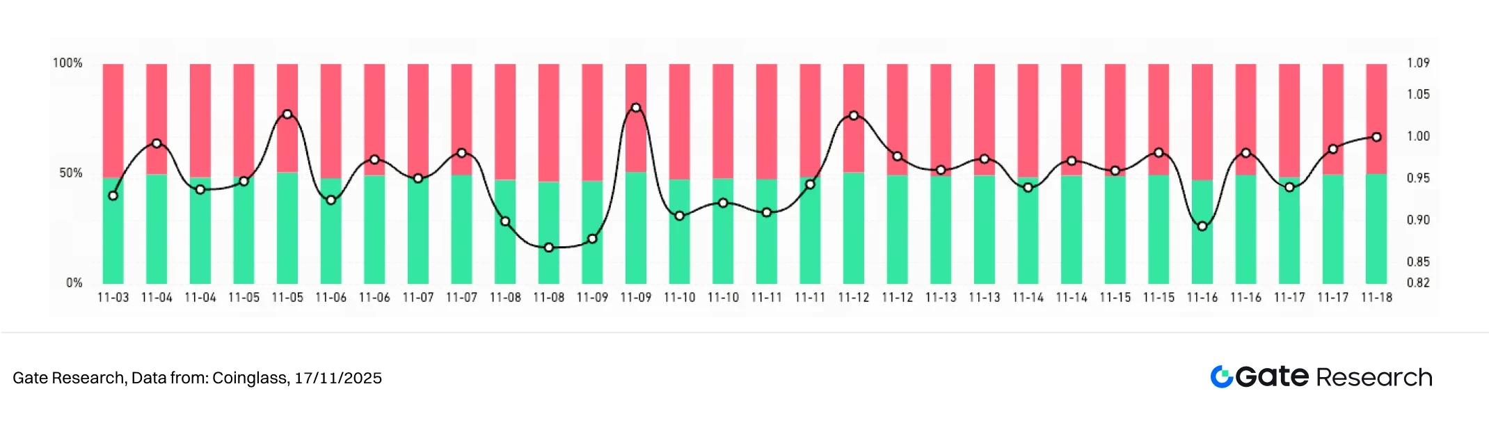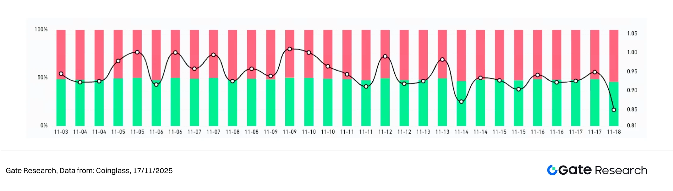 According to Coinglass data, from November 4th to November 17th, the long/short trading volume ratio (LSR) of BTC and ETH fluctuated narrowly around 1, indicating that market sentiment continued to struggle in a weak market, and funds did not form a unified direction. [5]