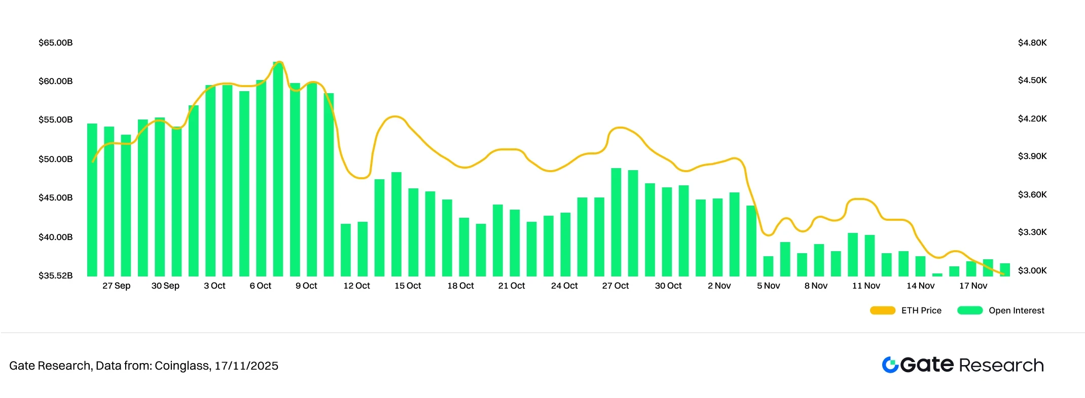 According to Coinglass data, the open interest in BTC and ETH futures contracts has been weakening for the past two weeks, showing no significant recovery after the large-scale deleveraging at the end of October, and remaining at a low level overall. Current open interest (OI) structure indicates that market sentiment is conservative, and funds have not re-entered the market on a large scale. [6]