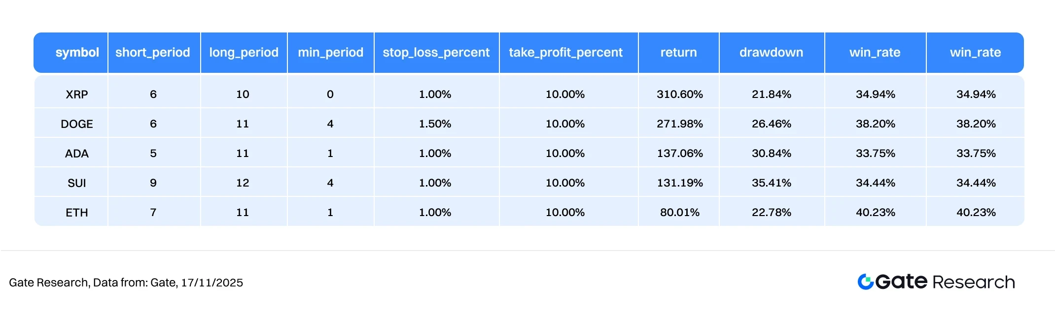 Taking the top ten crypto projects by market capitalization (excluding stablecoins) as an example, this article backtested 2-hour candlestick chart data from October 2024 to October 2025. The system tested a total of 891 parameter combinations and selected the ten combinations with the best annualized return. The evaluation criteria included annualized return, Sharpe ratio, maximum drawdown, and ROMAD (return to maximum drawdown ratio) to comprehensively measure the stability and risk-adjusted performance of the strategy under different market conditions.
