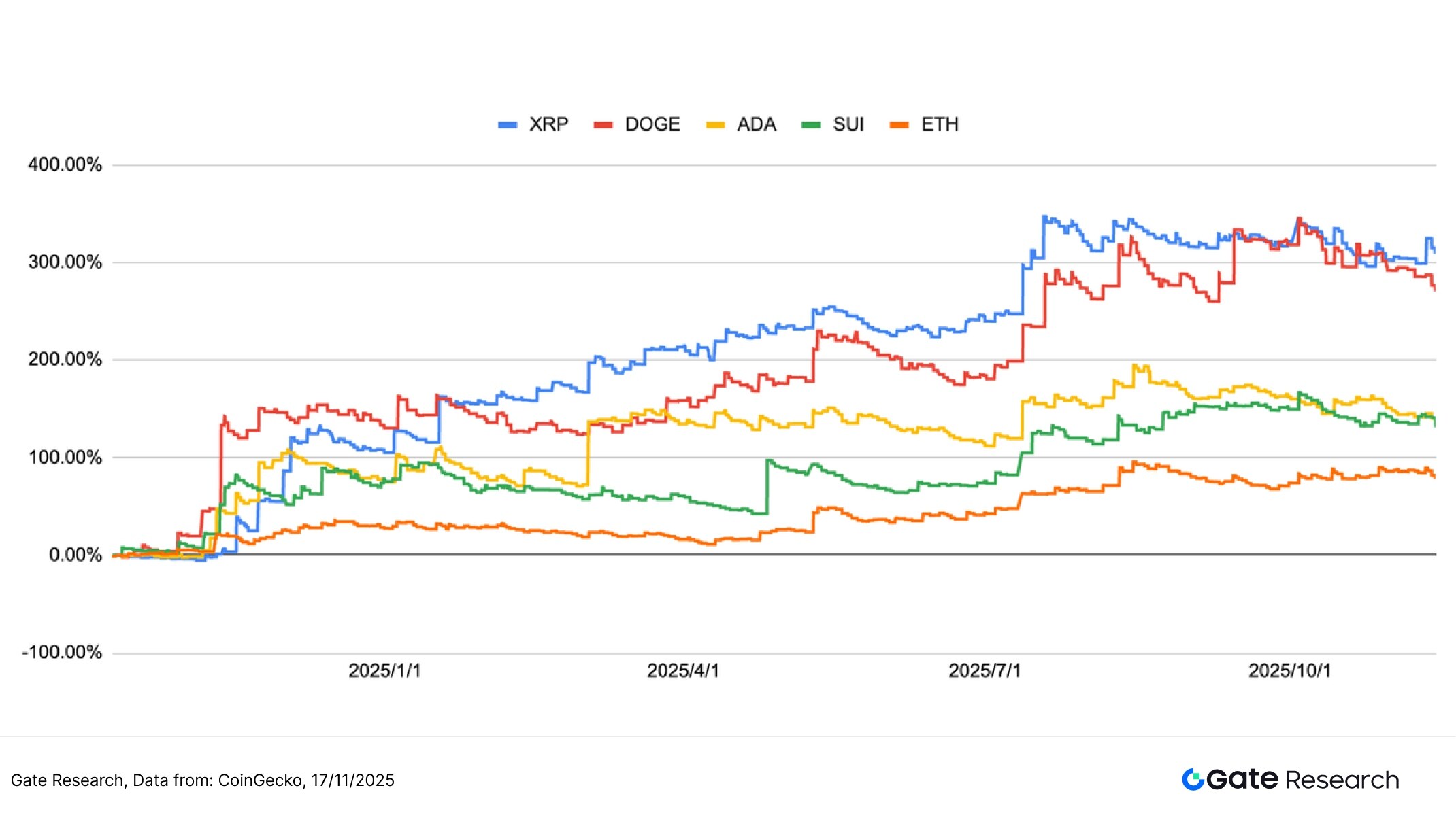 The backtesting period was from October 2024 to November 2025. Based on the cumulative return trend over the past year, the moving average trend breakout strategy showed significant divergence in performance across different mainstream and secondary asset classes, but maintained an overall stable upward structure. The return curves of the five assets in the chart mostly showed a stepped cumulative increase after the strategy triggered a bullish breakout signal. XRP, DOGE, and ADA performed the best, with the highest return rate exceeding 250%–330% at one point, demonstrating the strategy's significant ability to capture gains in strong sectors.