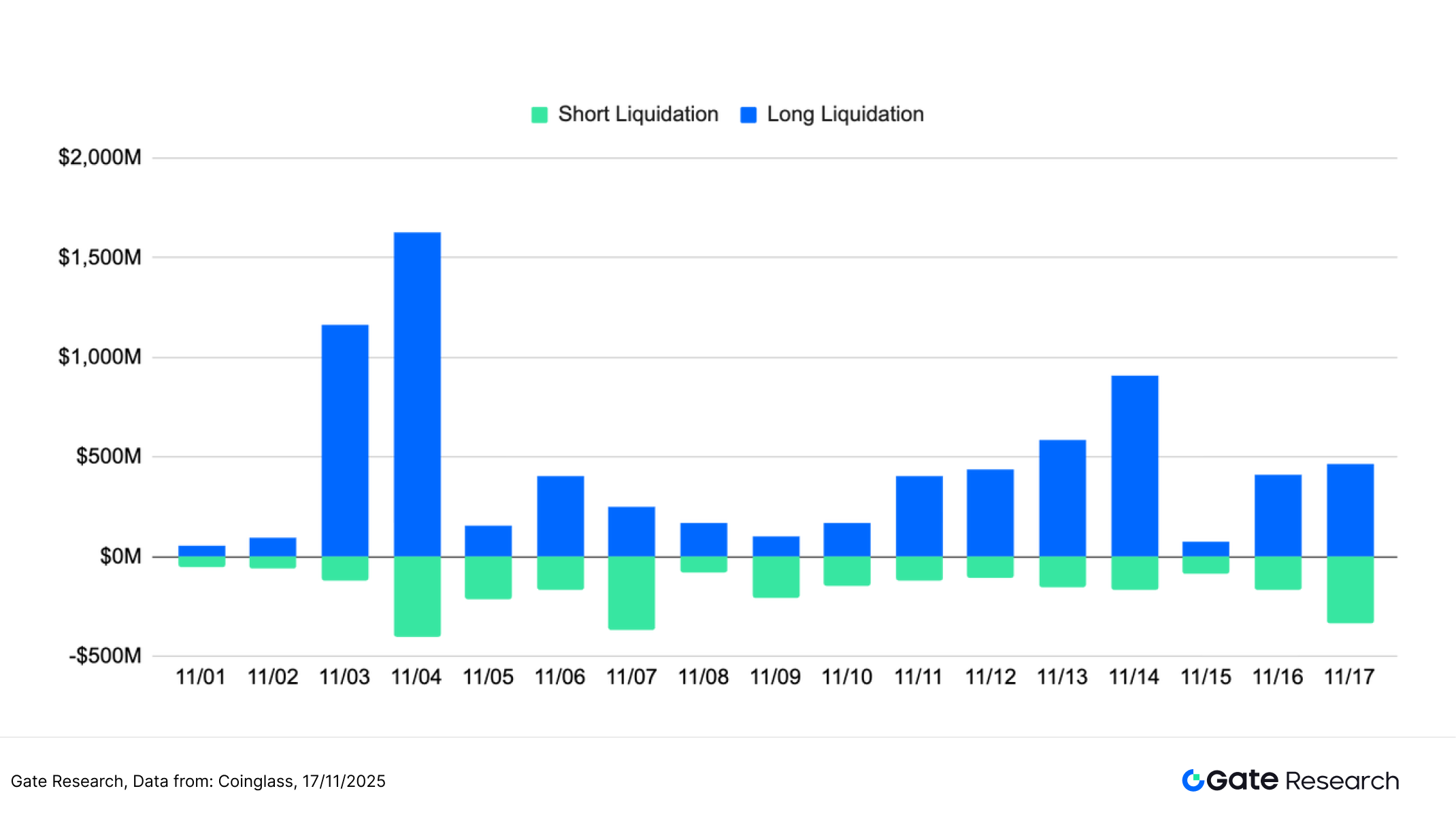 According to Coinglass data, the scale of long liquidations in the crypto market has been significantly higher than that of short liquidations in the past two weeks, indicating that highly leveraged long positions are under the heaviest pressure as the market continues to weaken. The largest wave of liquidations this month occurred on November 3rd and 4th, with single-day long liquidations rapidly escalating to over $1-1.5 billion, reflecting a concentrated and passive liquidation of long positions after the market broke through key support levels. [9]