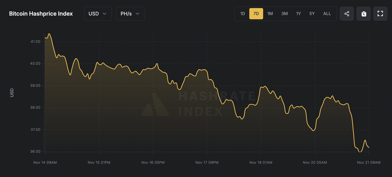 From the perspective of daily revenue per unit of computing power (Hashprice), Hashrate Index data shows that as of November 21, 2025, Hashprice was $36.19/PH/s/day. This week, Hashprice largely mirrored the price movement of Bitcoin, exhibiting a recovery trend after a pullback from its highs.