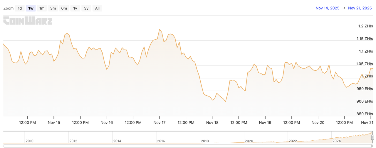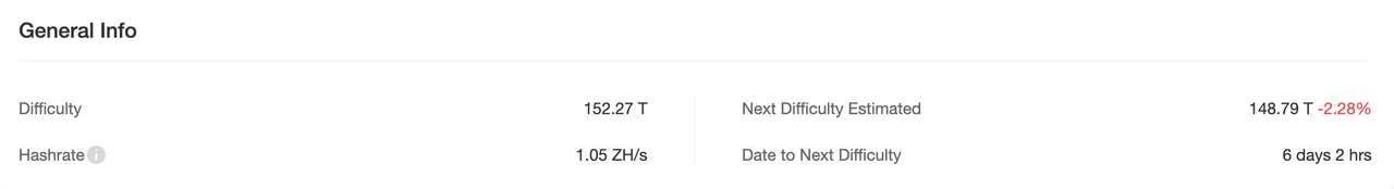 As of November 21, the total network hashrate reached 1.05 ZH/s, and the mining difficulty was 152.27T. The next difficulty adjustment is expected to take place on November 27, with an estimated decrease of 2.28%, bringing the difficulty to approximately 148.79T.